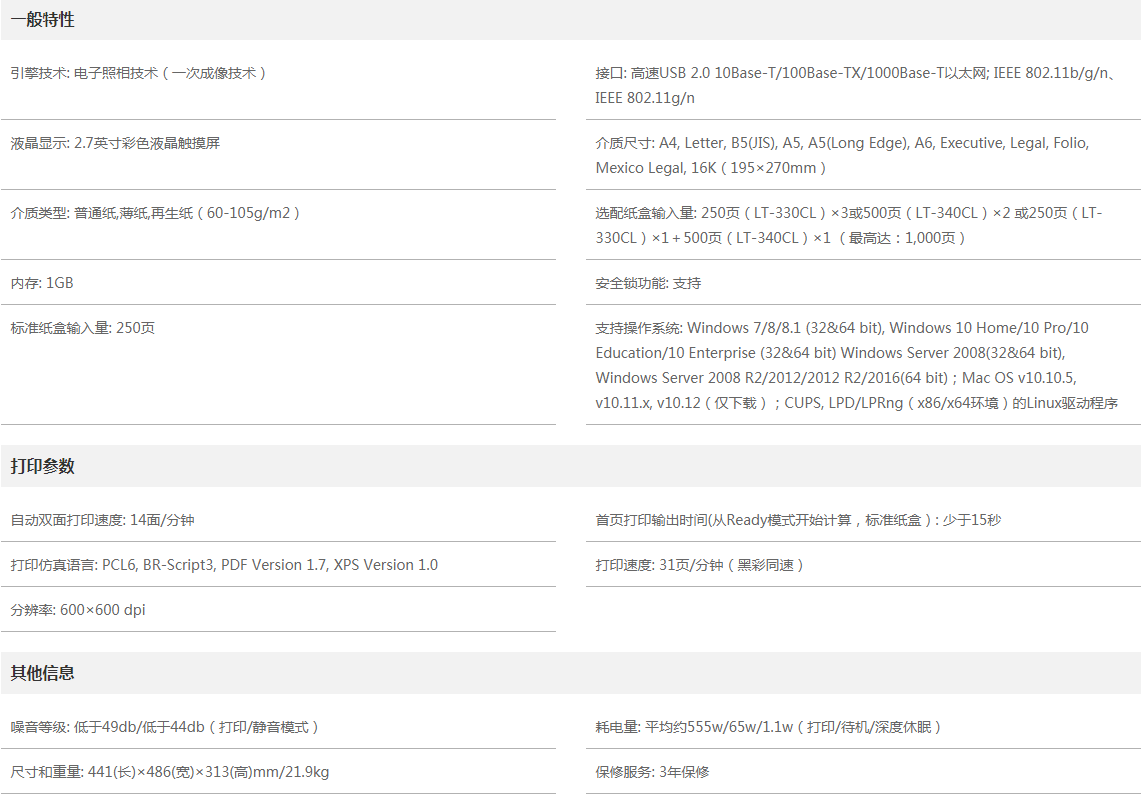 ● PCL6, BR-Script3, PDF Version 1.7, XPS Version 1.0高級(jí)打印語言
