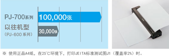 機(jī)器壽命達(dá)到A4尺寸約100000張※,達(dá)到以往機(jī)型的3倍以上。可長期放心使用。